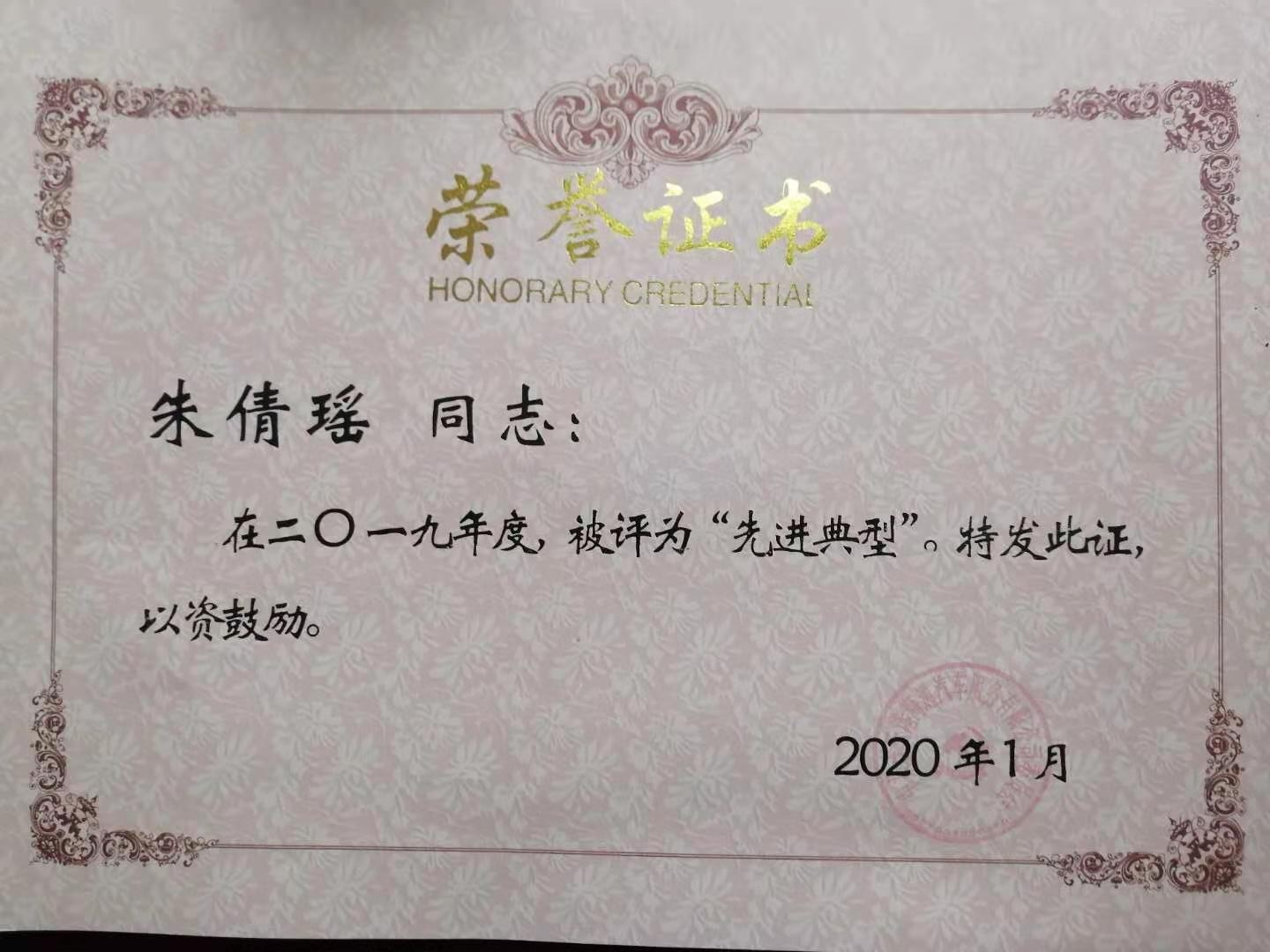 近日,蘇港檢測中心職工朱倩瑤榮獲汽服公司2019年度“先進典型”榮譽稱號。