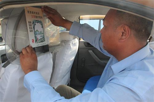 “旅游美時美刻,文明隨時隨地”“ 富強、民主、文明、和諧,自由、平等、公正、法治,愛國、敬業(yè)、誠信、友善”,4月24日,連汽公司出租車車廂內出現(xiàn)了以“文明旅游、社會主義核心價值觀”為主題的宣傳畫。